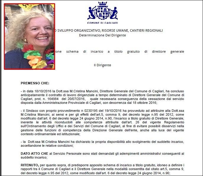 Clamoroso al Comune di Cagliari: la City Manager Cristina Mancini accetta un contratto gratis pur di continuare a sostenere il ...