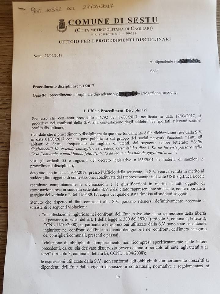 Sestu: vietato contestare su Facebook le scelte dell' Amministrazione Comunale. Anche se si parla di sicurezza stradale. Sospeso un operaio ...