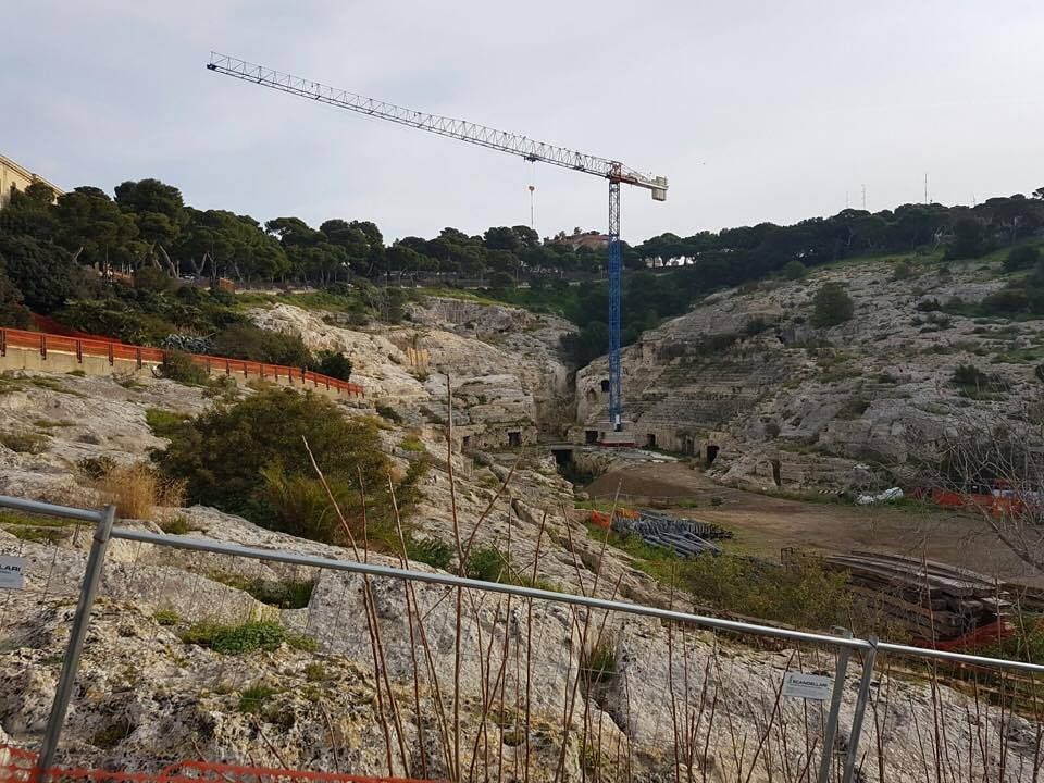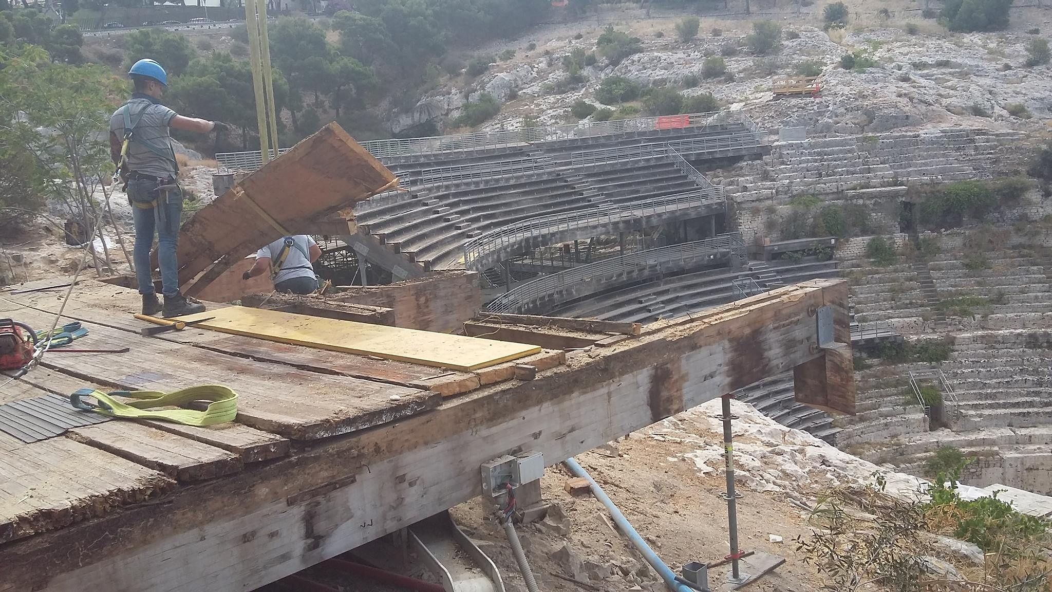 Operai al lavoro per levare finalmente la legnaia dall'anfiteatro. Fabrizio Marcello, Pd: "Oh gladiatore, che sei stato imbrigliato e incatenato, ...