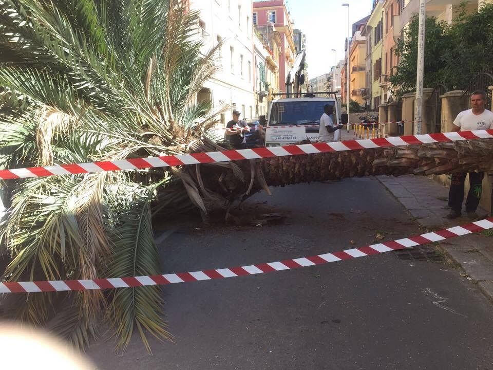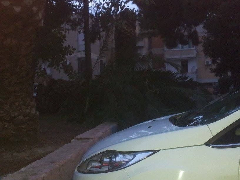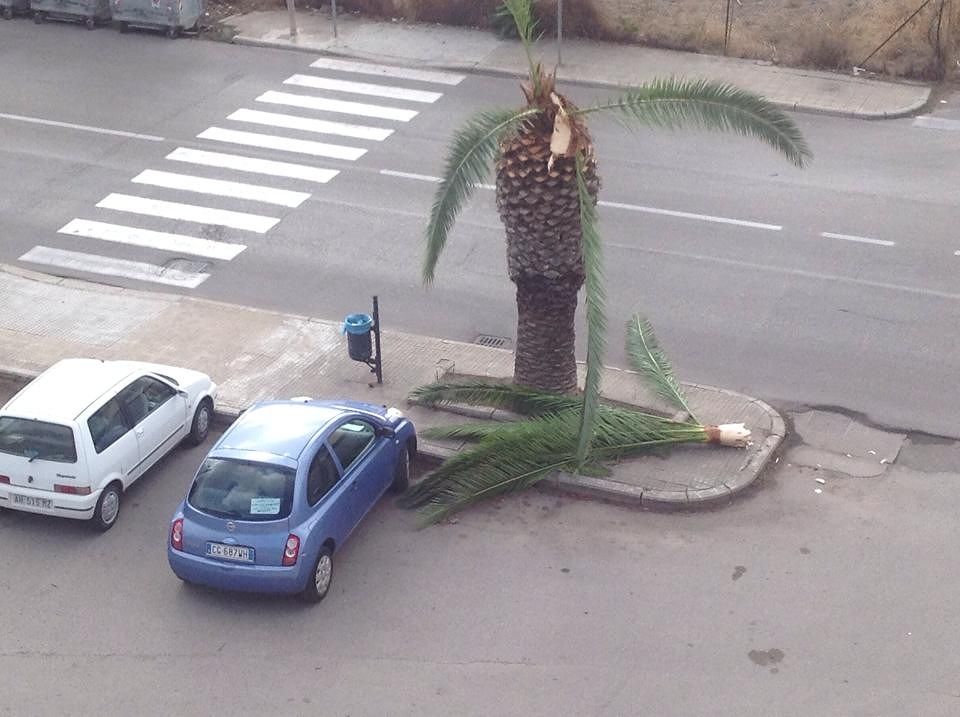 Palma crolla sopra un'auto nei parcheggi del Comune, paura ad Assemini