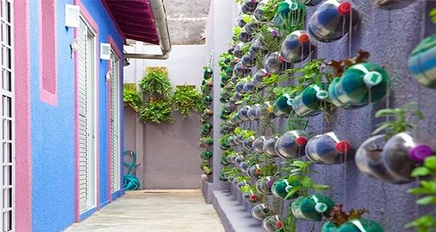 Centinaia di bottiglie di plastica diventano la struttura di un giardino verticale che adorna le pareti