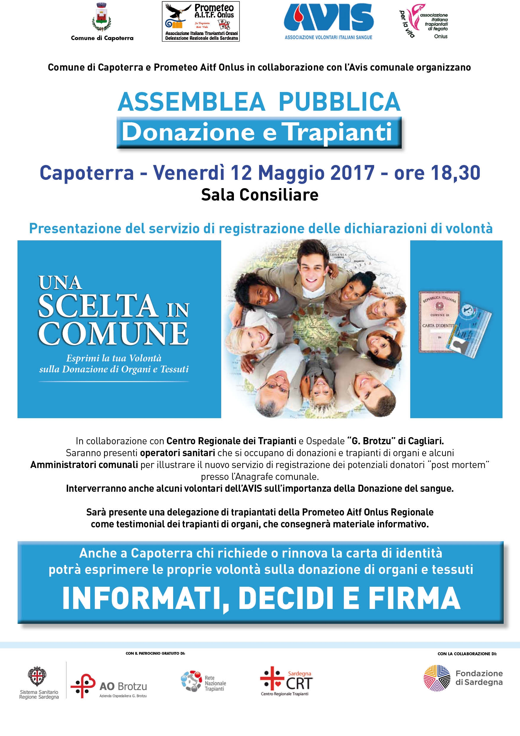 Venerdì 12 maggio 2017 Prometeo AITF Onlus, Amministrazione comunale e Avis locale organizzeranno a Capoterra una manifestazione per informare su trapianti e donazioni di organi e sangue