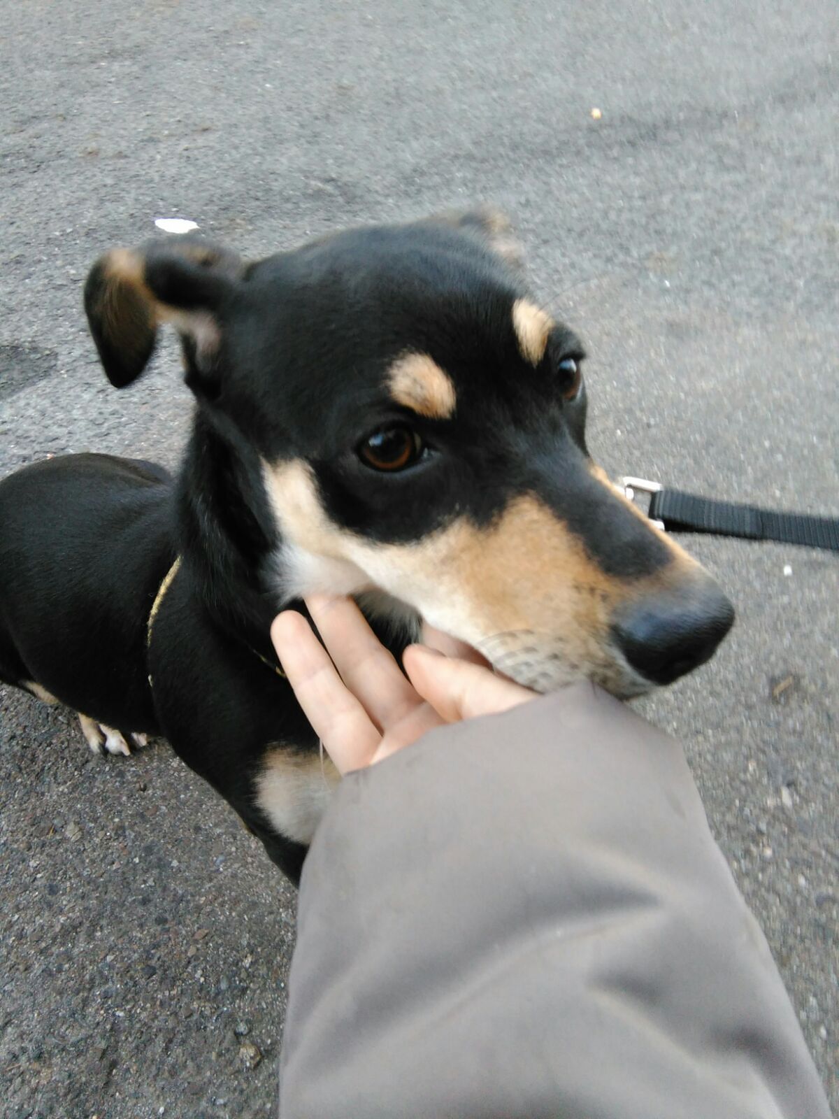 Un cagnetto nero focato con pettorina maculata