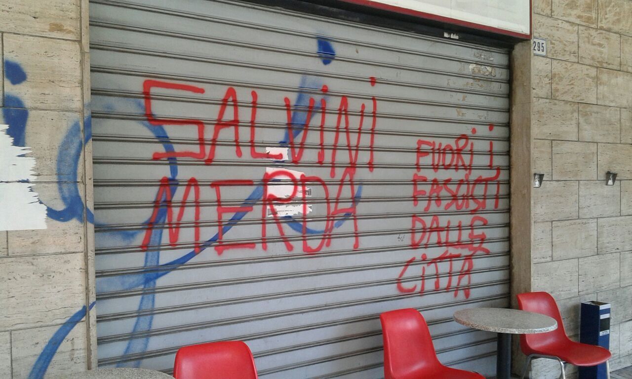"Salvini merda, fuori i fascisti dalla città". Frasi offensive con la bomboletta spray sono apparse la notte scorsa nella serranda ...
