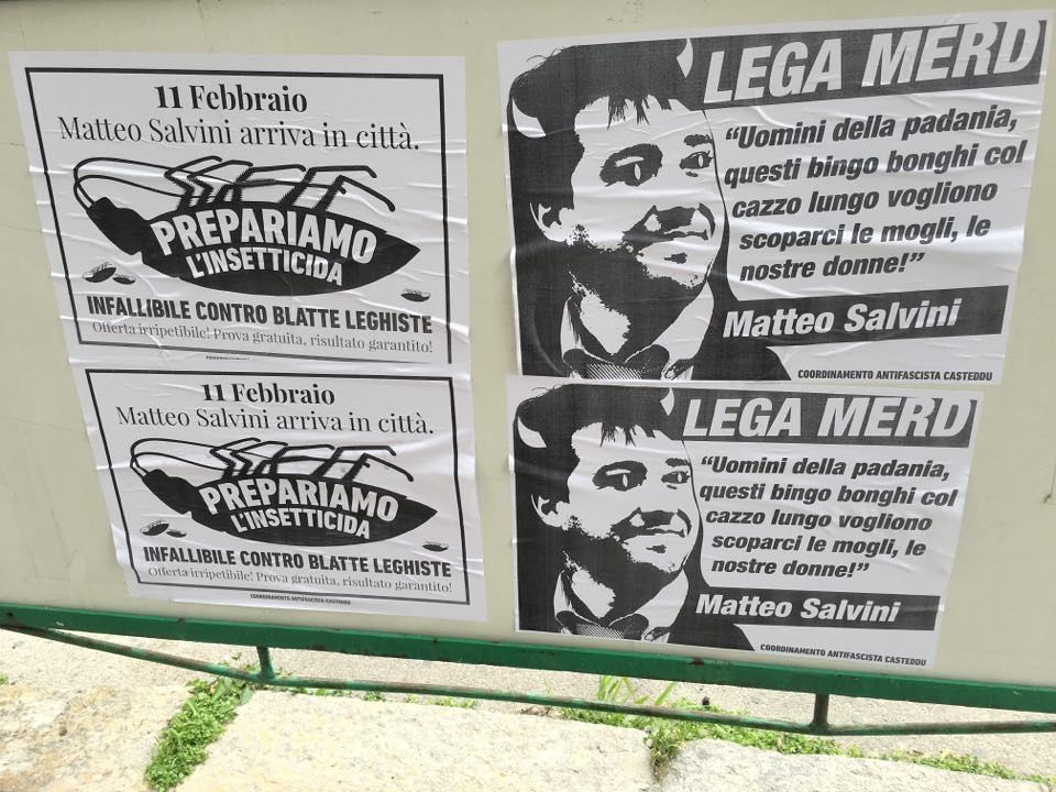 Blitz nella notte degli antifascisti, manifesti in tutta Cagliari che ironizzano su Salvini. Ipotizzato un suo slogan: "Binghi bonghi dal ...