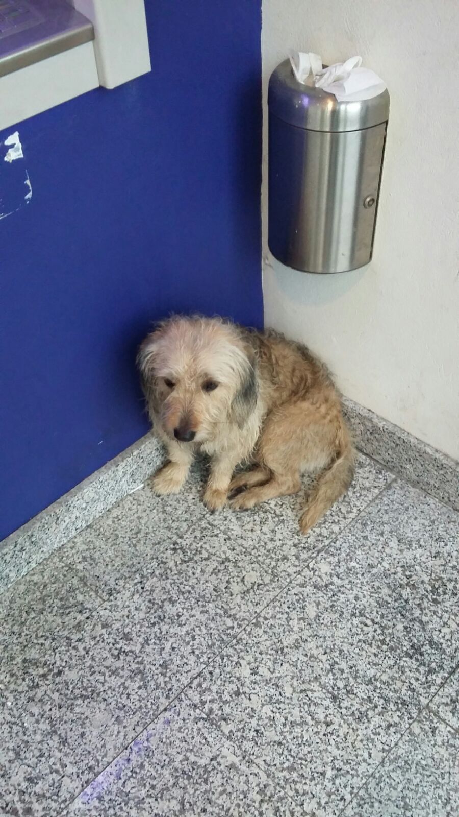 Il cane si è rifugiato all'ingresso della Banca Intesa