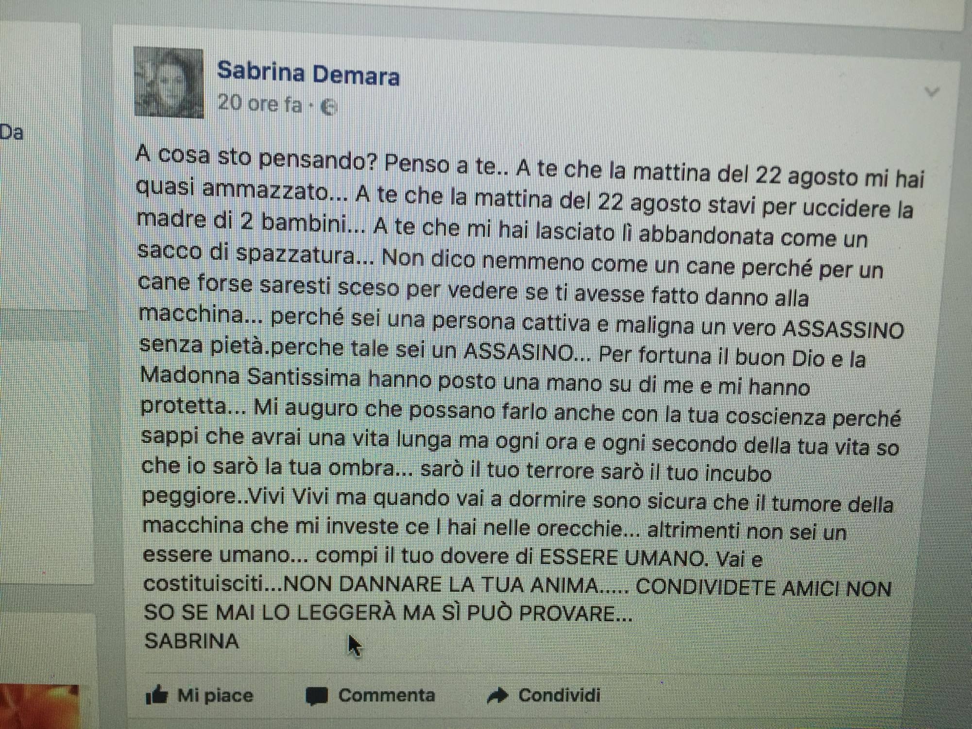 Sabrina, la donna coinvolta nei giorni scorsi in un brutto incidente a Tortolì, investita da un'auto pirata, con un post ...