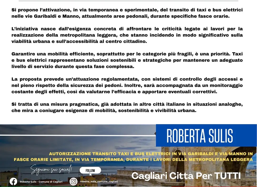 L’idea è concreta e immediata: consentire, in via temporanea e sperimentale, il transito di taxi e autobus elettrici in via Garibaldi e via Manno, ma solo in fasce orarie ben definite. Una misura pensata per alleggerire le difficoltà di spostamento, soprattutto per anziani, persone con mobilità ridotta e cittadini che ogni giorno devono raggiungere il cuore della città.