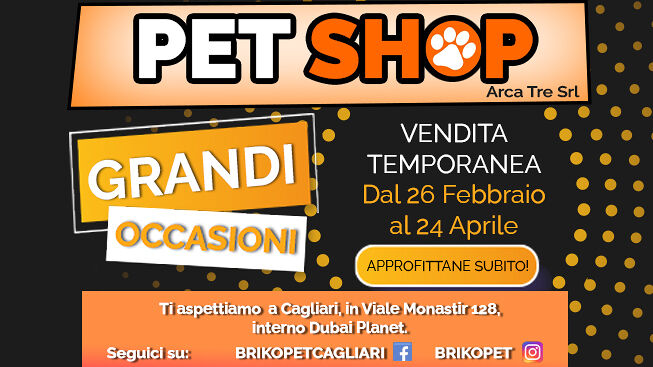 Dal 26 febbraio al 24 aprile la società Arca Tre Srl, in collaborazione con Dubai Planet, organizza una vendita temporanea. Nel Pet Shop sarà possibile acquistare tantissimi articoli delle migliori marche, per la cura e il benessere dei nostri adorati animali domestici. Il punto vendita, che ha un’estensione di circa 2.500 m², offre inoltre l’opportunità di acquistare tanti prodotti per la casa, per il fai da te e per il tempo libero.