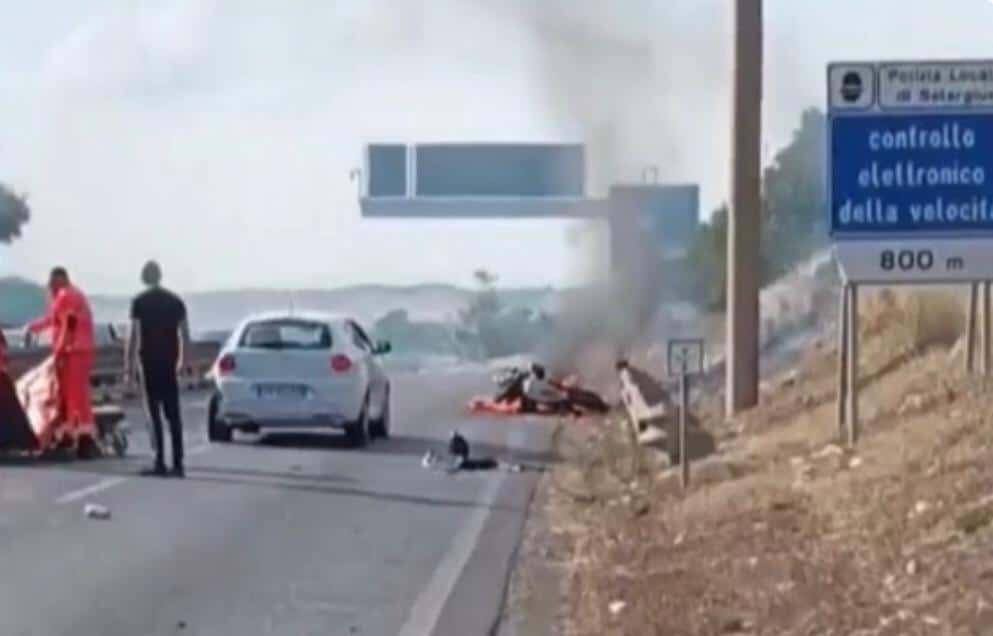 E’ letteralmente volato dalla sua moto, si è schiantato sull’asfalto procurandosi un gravissimo trauma al bacino mentre la sua moto prendeva fuoco. Terribile incidente stradale lungo la Statale 131 dir nel territorio di Selargius, a pochi chilometri dall’uscita da Cagliari. A scontrarsi, poco dopo il chilometro 5,2, una moto e un’auto: ad avere la peggio è stato il motociclista 40enne.