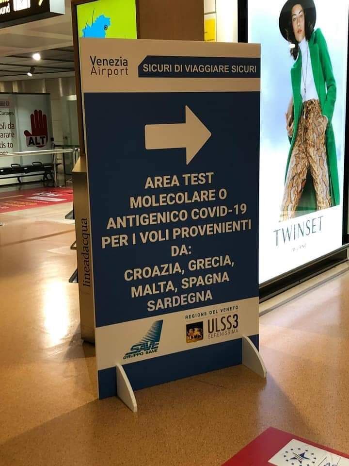 Area test covid-19 anche per chi arriva dalla Sardegna, all’aeroporto di Venezia i viaggiatori provenienti da Croazia, Grecia, Malta, Spagna e Sardegna sono invitati a recarsi nell’area test. Ugo Cappellacci: “Il governo impugna l’ordinanza di Solinas, per l’obbligo di tampone e consente di fare la stessa cosa alle altre regioni, ad iniziare dal Lazio per arrivare sino al Veneto”.