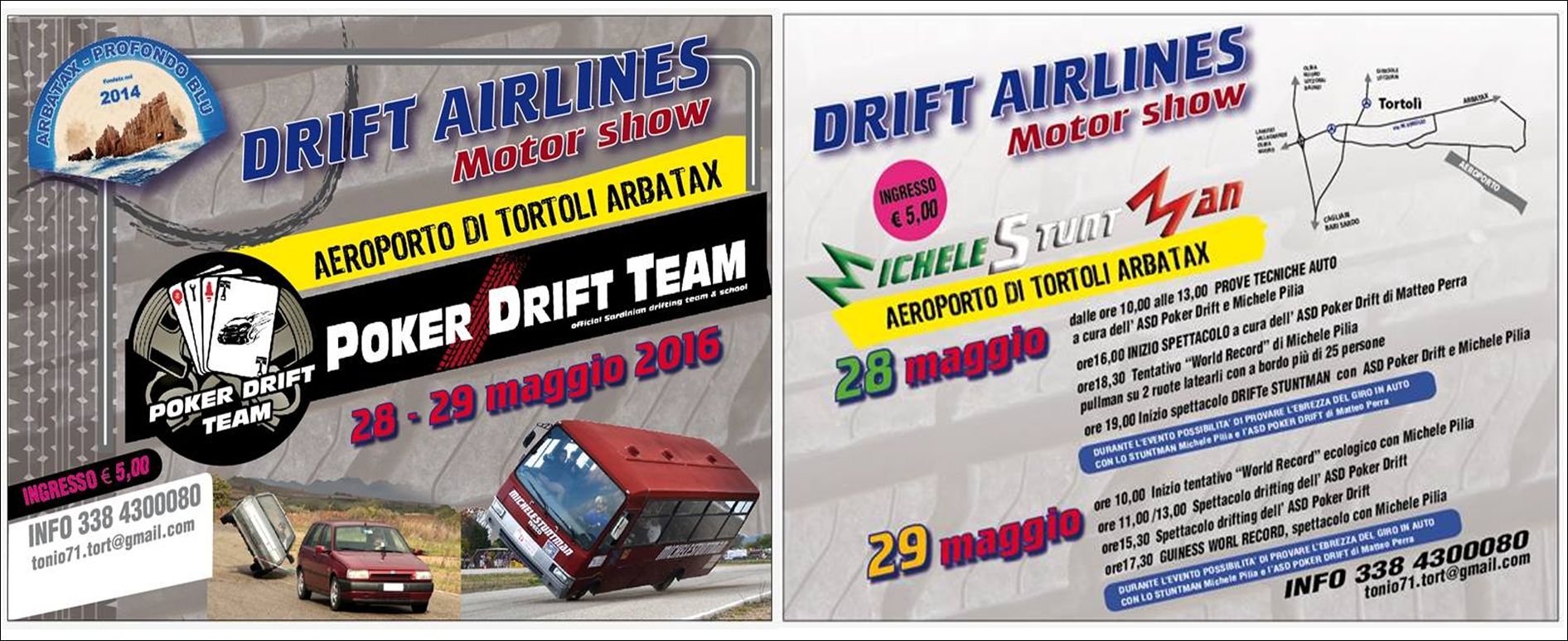 Le premesse per battere il nuovo prestigioso record ci sono tutte, d’altronde Michele Pilia non è nuovo ad esibizioni mozzafiato di questo genere. Stavolta, sarà l’ennesimo week end di numeri ed evouzioni con le due ruote: il “Drift Airlines Motor Show”, la manifestazione motoristica in programma sabato 28 e domenica 29 maggio a Tortolì, nella pista dell’aeroporto, darà altrettante soddisfazioni per appassionati e spettatori di evoluzioni da brivido. Lo stuntman di Dolianova, è detentore di diversi record mondiali della specialità.