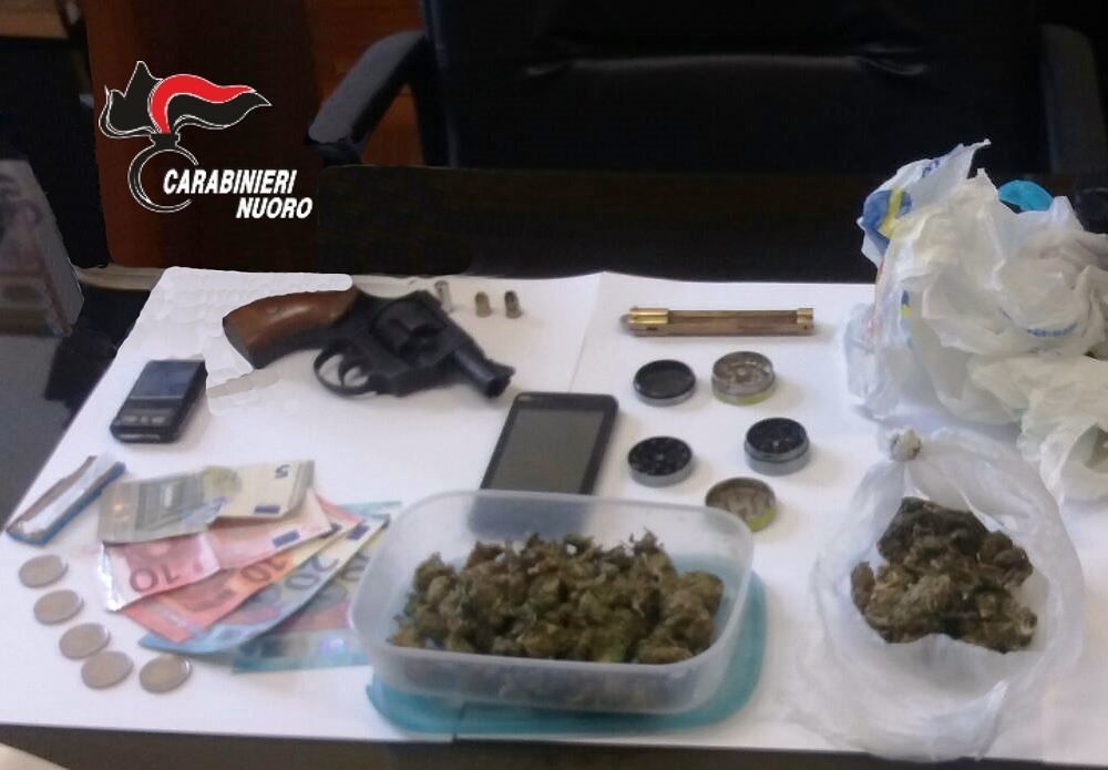 Un minorenne, del posto, è stato trovato in possesso di 34 grammi di marijuana, un coltello a farfalla, 75 euro in banconote di vario taglio. La perquisizione è proseguita in casa del giovanissimo dove i militari hanno trovato altri 50 grammi della stessa sostanza, suddivisa in dosi pronte per lo spaccio, un bilancino elettronico di precisione oltre a materiale per il confezionamento dello stupefacente, una pistola scacciacani calibro 38 a tamburo 09mmk, priva del tappo rosso; 3 cartucce a salve di cui due esplose ed una carica,