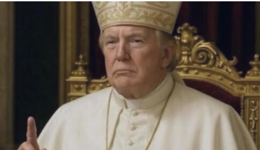 Nell’immagine, realizzata con l’ausilio dell’intelligenza artificiale, è raffigurato Trump in abito talare, con la mitra, il crocifisso al collo e in atto di benedire.