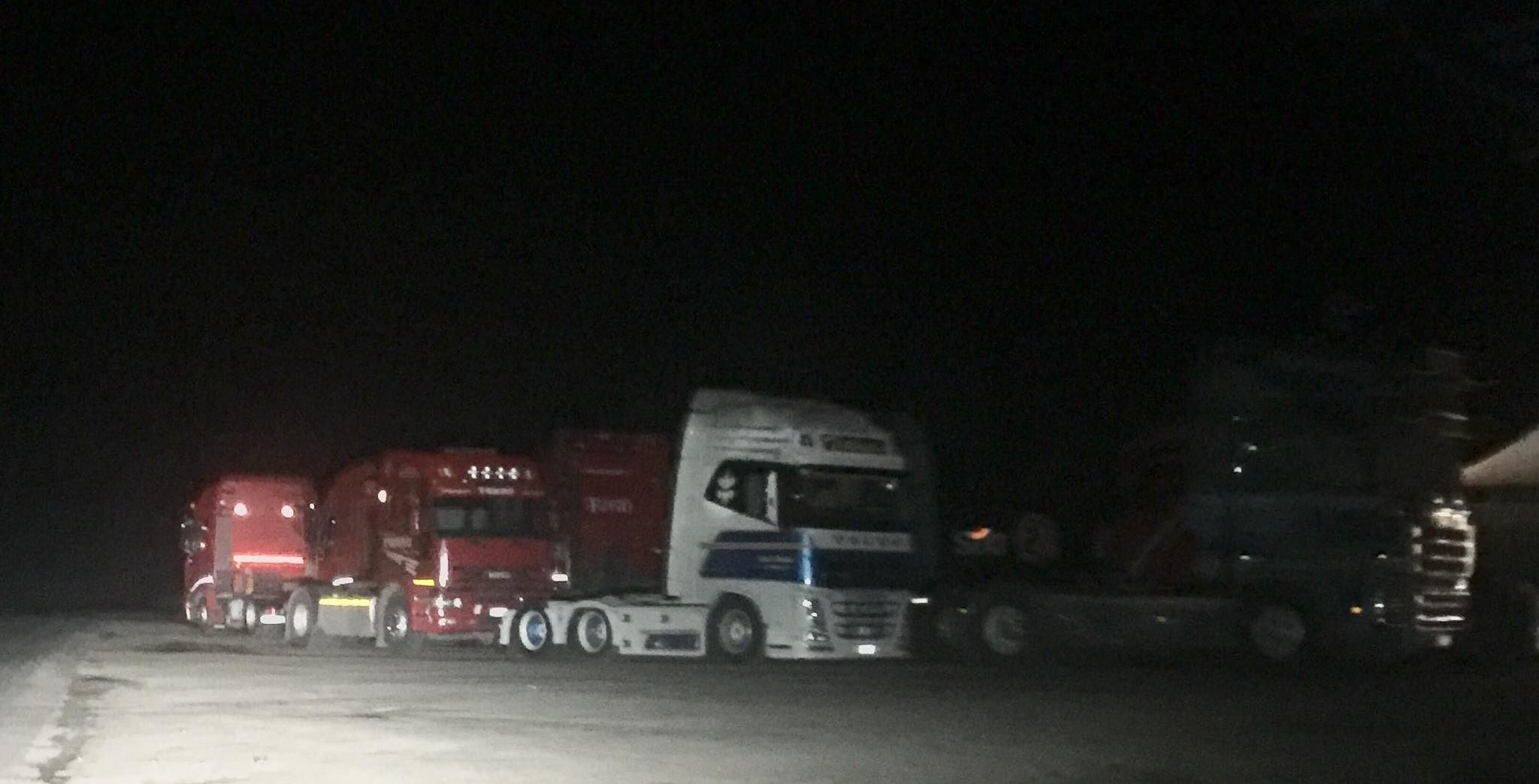 Operazioni lunghe. I rimorchi restano dentro la base. Le motrici, vuote, fuori. In bella mostra.