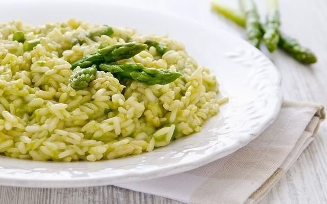 RISOTTO AGLI ASPARAGI 320 kcal 7,77 P 65,10 G 4,97 L RISOTTO AGLI ASPARAGI RISO 70 g ASPARAGI DI CAMPO 50 g OLIO EXTRA VERG.DI OLIVA 5 G CIPOLLE 5 g BRODO VEGETALE 140 g Preparazione METTERE IN UNA CASSERUOLA UN GOCCIO DI OLIO CON LA CIPOLLA TRITATA FINEMENTE, FAR IMBIONDIRE A PENTOLA COPERTA PER POCHI MINUTI. AGGIUNGERE LA PARTE VERDE DEGLI ASPARAGI TAGLIATI A PEZZETTI E FAR INSAPORIRE PER 5 MINUTI. VERSARE IL RISO E FARLO TOSTARE. UNIRE IL BRODO POCO ALLA VOLTA E PORTARE A COTTURA PER 20 MINUTI CIRCA (a cura di www.menutrix.it)