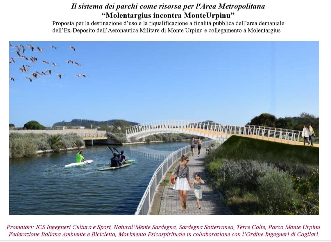 Un ponte ciclopedonale per collegare Monte Urpinu e Molentargius. La proposta e in progetto in anteprima dei ciclisti cagliaritani: “È la proposta che sarà presentata da varie associazioni, fra cui FIAB Cagliari, in occasione della manifestazione “Monumenti Aperti”Il compendio Monte Urpinu – Molentargius rappresenta uno dei principali attrattori ambientali dell’Area Metropolitana di Cagliari. L’intervento prevede la riqualificazione per utilizzo pubblico del complesso dell’Ex Deposito dell’Aeronautica Militare e il ripristino dell’antica viabilità rurale di “Mammaranca” che, dalle pendici del colle, consentiva di raggiungere il parco agricolo di Medau Su Cramu oltrepassando l’attuale Canale di Terramaini.