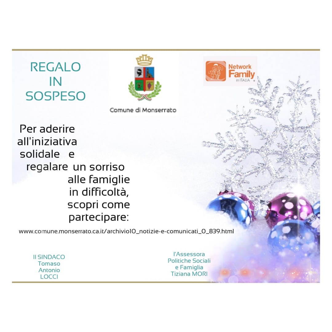 Il Comune di Monserrato con Sindaco Tomaso Antonio Locci grazie alla fattiva collaborazione tra l’Assessorato Politiche Sociali e Famiglia e l’Assessorato Commercio e Attività produttive, in collaborazione con la Caritas Parrocchiale della Parrocchia di Sant’Ambrogio e la Conferenza Vincenziana San Giovanni Bosco, organizza nell’anno 2021 l’iniziativa natalizia a carattere solidale “REGALO SOSPESO … ASPETTANDO IL SANTO NATALE”, I edizione.