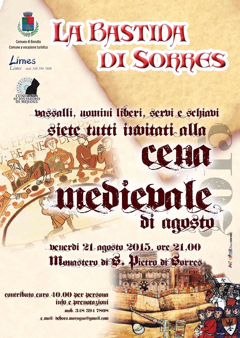 I tre giorni della Bastida di Sorres inizieranno in grande stile. Venerdì 21 agosto alle ore 21 una cena medievale all’interno del monastero di San Pietro di Sorres – a cura dell’esperto enogastronomo e giornalista GIOVANNI FANCELLO – permetterà ai partecipanti di immergersi nell’atmosfera giusta per vivere appieno l’epopea che rievoca la battaglia tra Doria e Aragonesi. Le manifestazioni legate alla Bastida cominceranno dal tardo pomeriggio con la conferenza su archeologia medievale e