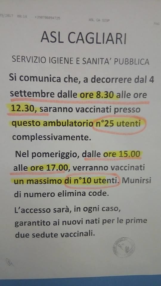Molta indignazione e preoccupazione dei genitori che si stanno rivolgendo alla Asl di Quartu, alcuni anche da oltre un mese, per poter effettuare i vaccini obbligatori ai loro figli. Sono ancora davvero tanti i minori da vaccinare, ma ogni settimana i fortunati potranno essere solo, al massimo 25 la mattina di lunedì, mercoledì e venerdì e 10 il pomeriggio di martedì e giovedì, per un totale di 95 ogni settimana e dunque 380 al mese tra bambini e ragazzi dai 0 ai 16 anni con precedenza ed accesso garantito ai nuovi nati per le prime due sedute vaccinali. Mancando circa quattro mesi alla scadenza dei termini per poter regolarizzare e così continuare ad accedere ai servizi che in caso contrario sarebbero automaticamente sospesi , oltre che dover pagare una multa da 100 fino a 500 euro, procedendo di questo passo, considerato che necessitano due sedute, sarà praticamente impossibile poter regolarizzare tutti. Molti genitori, in nostra presenza, hanno domandato al personale se fosse possibile iniziare a prenotare ma la risposta è stata negativa : “Non si può prenotare, l’ unico modo è fare la fila e sperare di essere fra i primi, se no dovrete tornare fintanto che non sarete più fortunati” .