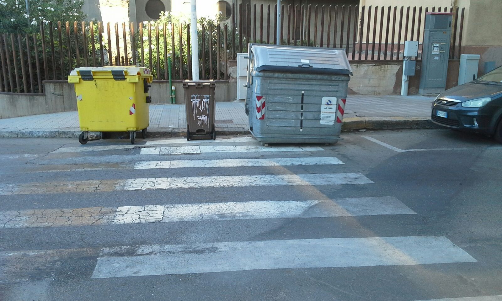 Pericolo per i pedoni che attraversano la strada in via Carrara, all’angolo con via de Gioannis. Come ci racconta un nostro lettore, Andrea C., “le strisce pedonali sono perennemente occupate da cassonetti dei rifiuti urbani. Tali cassonetti di fatto occultano la visibilità dei pedoni che si accingono ad attraversare la strada e quella degli automobilisti che transitano in via Carrara. Il pericolo è concreto, specialmente negli orari di ingresso delle scuole”. Nella foto, scattata questa mattina, sono ben visibili i cassonetti in mezzo alle strisce pedonali.