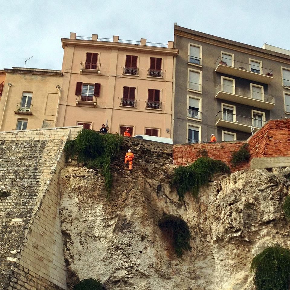 Intervento spettacolare nel centro storico. All’opera la squadra di rocciatori specializzati per la messa in sicurezza del costone roccioso di Castello, sotto la via del Fossario. Il sindaco Massimo Zedda spiega cosa sta accadendo: “È un intervento previsto e annunciato nelle scorse settimane, ma reso ancora più urgente dagli eventi di questi giorni”. Un’operazione a sorpresa, per combattere il rischio crolli nella parte più antica della città, il cuore della vecchia Cagliari. E tanti cagliaritani si sono fermati a guardare i “rocciatori”, una figura davvero insolita in città.