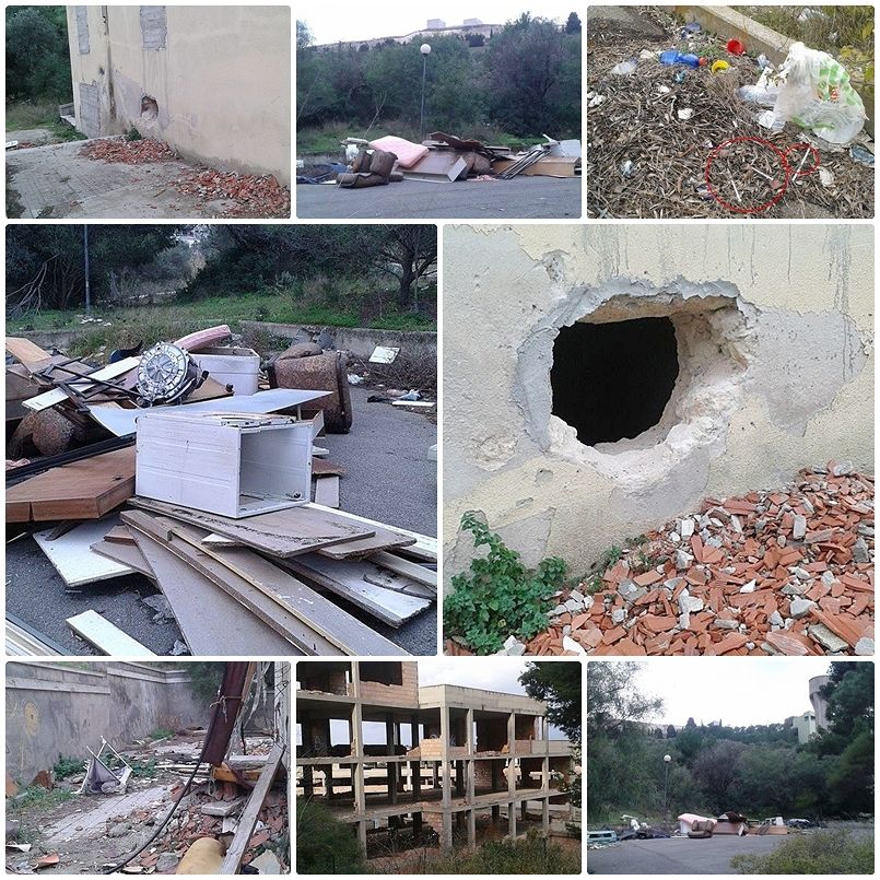 Un luogo apparentemente nascosto, di cui abbiamo avuto modo di parlare spesso e di denunciare cosa accade lì attorno. Ben conosciuto alle coppiette in cerca di svago in auto, ai tossici e ovviamente, a carrozzieri, muratori, gommisti e semplici cittadini di Cagliari e hinterland che, se devono scaricare i rifiuti, ci vanno a colpo sicuro. La zona, la conoscono molto bene anche le forze dell’ordine, al Comune di Cagliari, poi anche la polizia municipale e anche i proprietari (privati) a cui competono le aree spesso e continuamente prese di mira dai vandali, clochard e drogati, in mezzo ai fortini del periodo bellico. Sì, quelli di fatto mai valorizzati, nascosti tra cespugli e la sporcizia. E poi che dire, stando col naso all’insù, c’è la visuale del bellissimo parco del Colle di San Michele, a destra il mastodontico ospedale Brotzu, alle spalle Microcitemico e Oncologico e dirimpetto, lo scheletro fatiscente di ciò che sarebbe dovuta diventare una struttura di assistenza o forse, una casa di riposo mai nata.