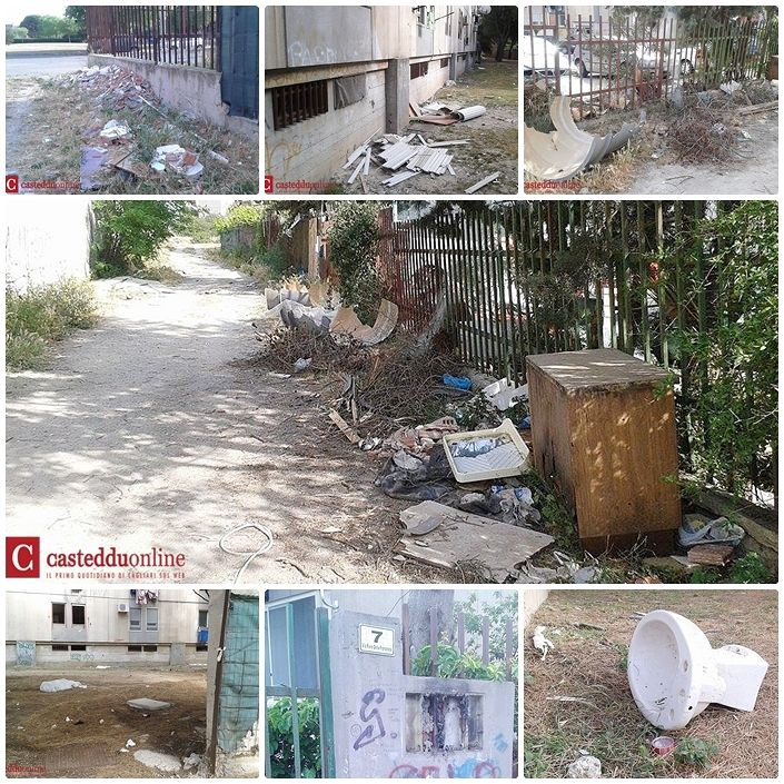 Calcinacci, vecchie tapparelle, inerti e rifiuti, addirittura un water e le siringhe. Il perimetro dei “palazzoni” grigi delle case parcheggio di via Piero Della Francesca, a Mulinu Becciu, è pieno zeppo di ogni cosa. I citofoni esterni? Un lusso, come pure il cancello esterno del piazzale, sempre spalancato, rotto chissà da quanto tempo. I lavori alla facciate degli appartamenti? Un ennesimo miraggio, si aspetta con fiducia l’arrivo degli operai coordinati dal Comune di Cagliari, per i quali i finanziamenti per le opere di manutenzione sono già in cassa. A dirla tutta, spesso e volentieri non sono sempre le Istituzioni a dover pagare pegno per lo schifo e le porcherie buttate per strada o tra i palazzi cosiddetti “ghetto” della città: spesso ci sono gli incivili che, fregandosene di regole di buona convivenza, abbandonano ogni cosa inservibile. Nel menefreghismo totale.