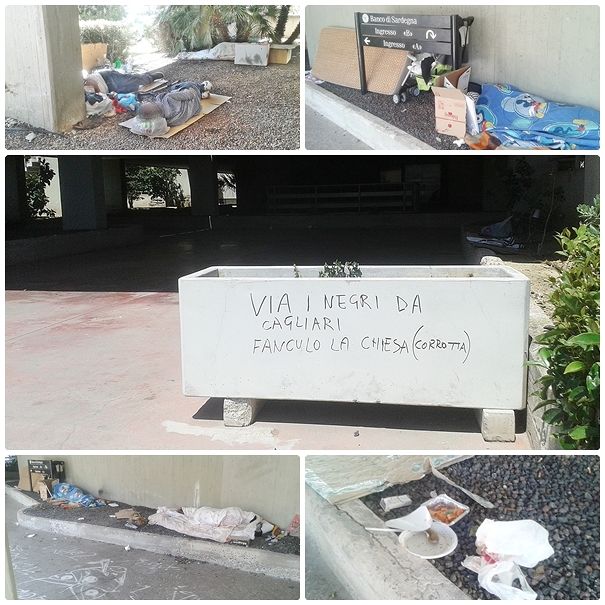Almeno una decina le persone che dormono ogni giorno in quell’area, con cartoni e coperte per riposare: resti di cibo e sporcizia, insieme ad un odore nauseabondo di escrementi rendono però la zona degradata. Ma ciò non giustifica minimamente l’opera di persone ignoranti che su un blocco di cemento di una fioriera hanno scritto frasi offensive contro le persone di colore e contro la Chiesa, un gesto da condannare di gravità assoluta. L’auspicio è che il Comune di Cagliari prenda seriamente in esame la vicenda: non basta uno sgombero forzato come è avvenuto nei giorni scorsi per ripristinare ordine e rispetto per il decoro degli spazi pubblici e nei confronti di un privato , come in questo caso un istituto di credito in centro città.