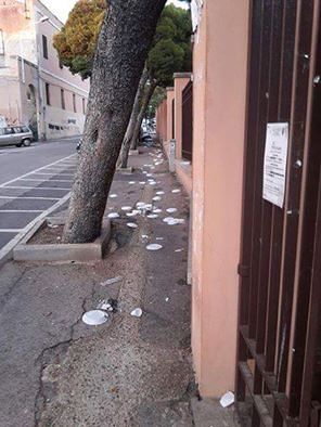 Viale Fra Ignazio da Laconi, una distesa di piatti di plastica sul marciapiede. Arte moderna? Neanche per idea. Un regalo dei migranti che dopo essersi rifocillati alla Caritas hanno ringraziato la città trattandola come una discarica. Senza contare che la strada attraversa il polo universitario e centinaia di studenti sono costretti a questo degrado. Integrazione? Qua manca proprio l’abc.