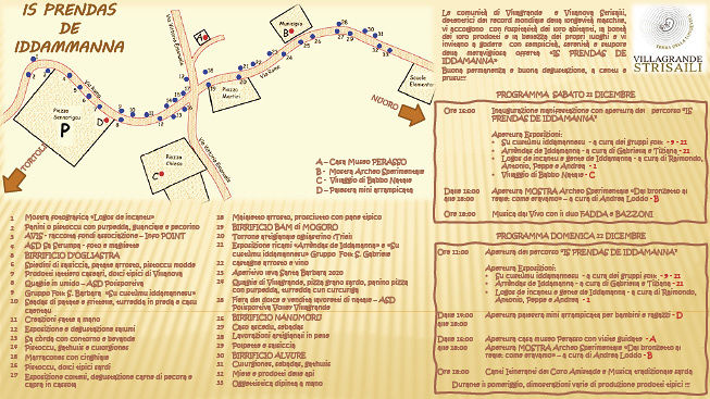 La manifestazione avrà luogo lungo la Via Roma a Villagrande Strisaili dalle ore 16:00 del 21 dicembre e proseguirà per tutta la giornata del 22 dicembre.