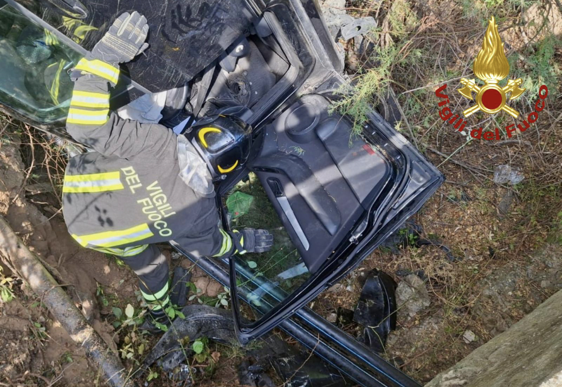 Un’autovettura, per cause ancora in corso di accertamento, é uscita fuoristrada ribaltandosi sul greto di un corso d’acqua.