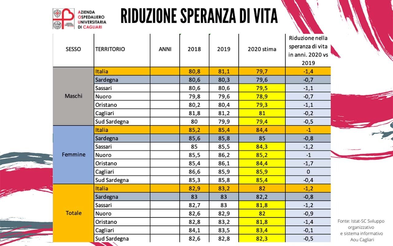 In Italia la riduzione rispetto all’anno 2019 è stimata in -1,2 anni attestandosi complessivamente a 82 anni. In Sardegna la riduzione è meno marcata (-0,8 per le donne e -0,7 per gli uomini) attestandosi complessivamente a 82,2 anni, 85 anni per le donne e 79,6 anni per gli uomini. Nel 2019 si raggiungevano gli 83 anni, 85,8 anni per le donne e 80,3 anni per gli uomini. Le province dove si registrano le maggiori riduzioni sono Oristano (-1,4 anni) e Sassari (-1,2 anni). Le riduzioni hanno interessato in diversa misura sia le donne (- 1,7 Oristano e -1,2 Sassari) che gli uomini (- 1,1 a Oristano e a Sassari). La speranza di vita nel 2019 raggiungeva gli 83,2 anni a Oristano (86,1 anni per le donne e 80,4 anni per gli uomini) e 83 anni a Sassari (85,5 anni per le donne e 80,6 anni per gli uomini). Riduzioni anche nelle provincie di Nuoro (-0,9), Sud Sardegna (-0,5) e città metropolitana di Cagliari (-0,1).