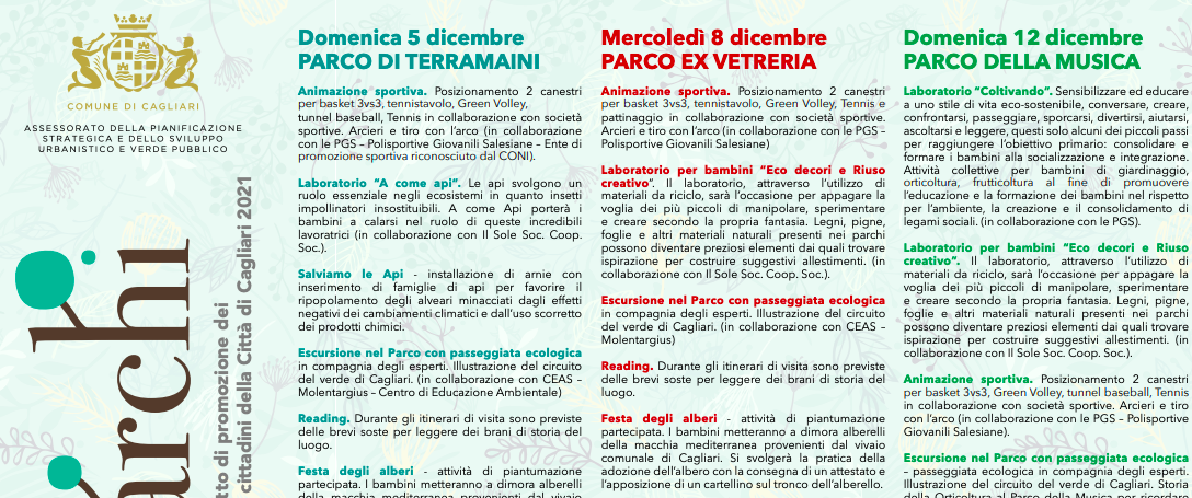 L’iniziativa, articolata su sei manifestazioni svolte durante tutto il mese di dicembre 2021, è promossa dall’Assessorato della Pianificazione Strategica e dello Sviluppo Urbanistico e Verde Pubblico del Comune di Cagliari, con l’organizzazione dell’Associazione Enti Locali per le Attività Culturali e di Spettacolo e in collaborazione con l’Assessorato della Pubblica Istruzione, Beni Culturali, Informazione, Spettacolo e Sport della Regione Sardegna, con la Fondazione di Sardegna, il Parco Molentargius Saline, l’ente di promozione sportiva PGS e con Il Sole Società Cooperativa Sociale.