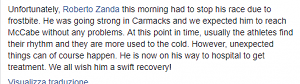 “Purtroppo, Roberto Zanda stamattina ha dovuto fermare la sua corsa a causa del congelamento. Stava andando forte a Carmacks e ci aspettavamo che raggiungesse Mccabe senza problemi. In questo momento, di solito gli atleti trovano il loro ritmo e sono più abituati al freddo. Tuttavia, possono accadere cose inaspettate. Ora sta andando in ospedale per farsi curare. Tutti gli auguriamo una rapida guarigione!